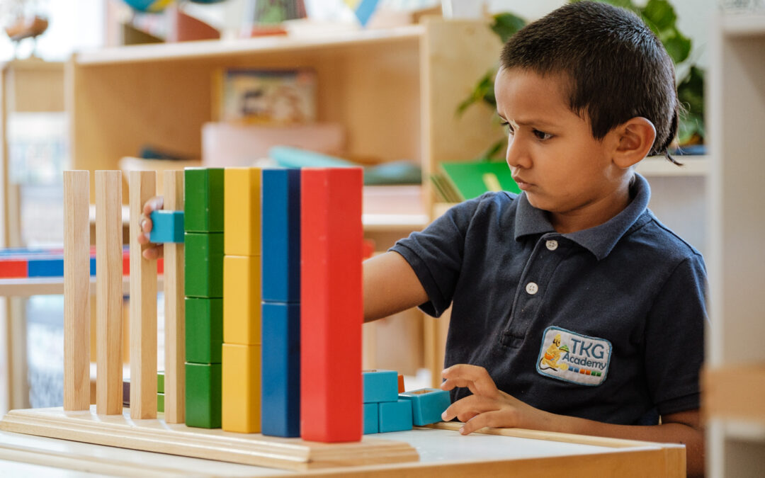 Grady cuts and prepares mango snacks for his classmates. Kairava is working on the Beginning Reading Object box. She reads the CVC words on the labels and matches them to the corresponding object.