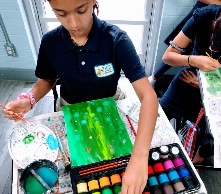 In their first art class of the year, Upper Elementary and Middle School students step into gardens they create. They are learning about Gustav Klimt and his impressionist art, mimicking his “Flower Garden” pieces with acylic pain.