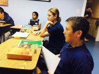 Middle School & High School Literature class students make connections between Bhagavad-Gita and Oliver Twist. As part of their Literature Study Unit in the morning Language Arts class, taught by Mother Mani Manjari (Mrs. Melissa Flores), students analyzed the high school classic, Oliver Twist, connecting it with the sacred text, the Bhagavad Gita. Students were expected to write an essay, connecting a chosen concept and event in Oliver Twist with a Bhagavad Gita verse. They were to include Srila Prabhupada’s commentary and their own personal commentary, explaining how to view the novel through the eyes of sastra. This synthesis of Scripture and Literature is the basis for our Language Arts study in all grades. How lucky these kids are!