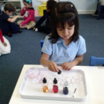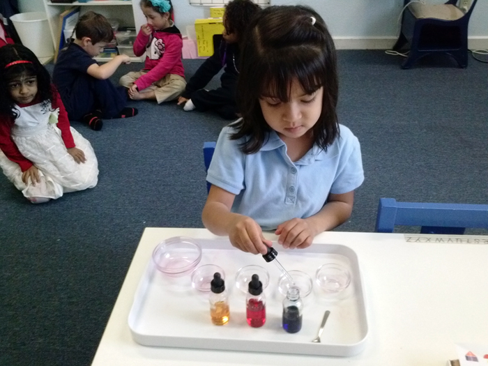 We added color mixing work to our classroom where the children learn to make different colors by using three primary colors. In a systematic process, they are held responsible for setting up, identifying the colors, mixing them, and cleanup.