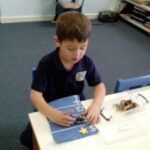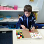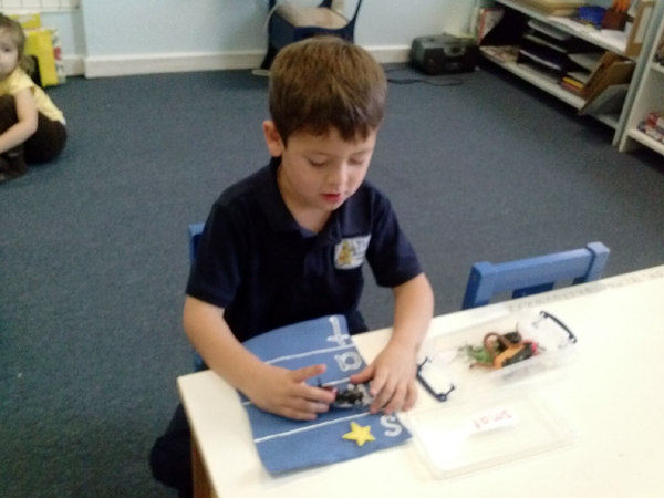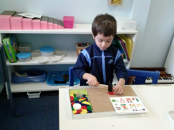 We also added a hammering work where they use a hammer and nails to fasten together pattern blocks. This has become a favorite! Placing the hammer on the small spot where the nail is located is difficult for little hands! If they miss, they could pinch their fingers. This provides the foundation for fine motor control, which will be used in handwriting and cursive in upper levels.