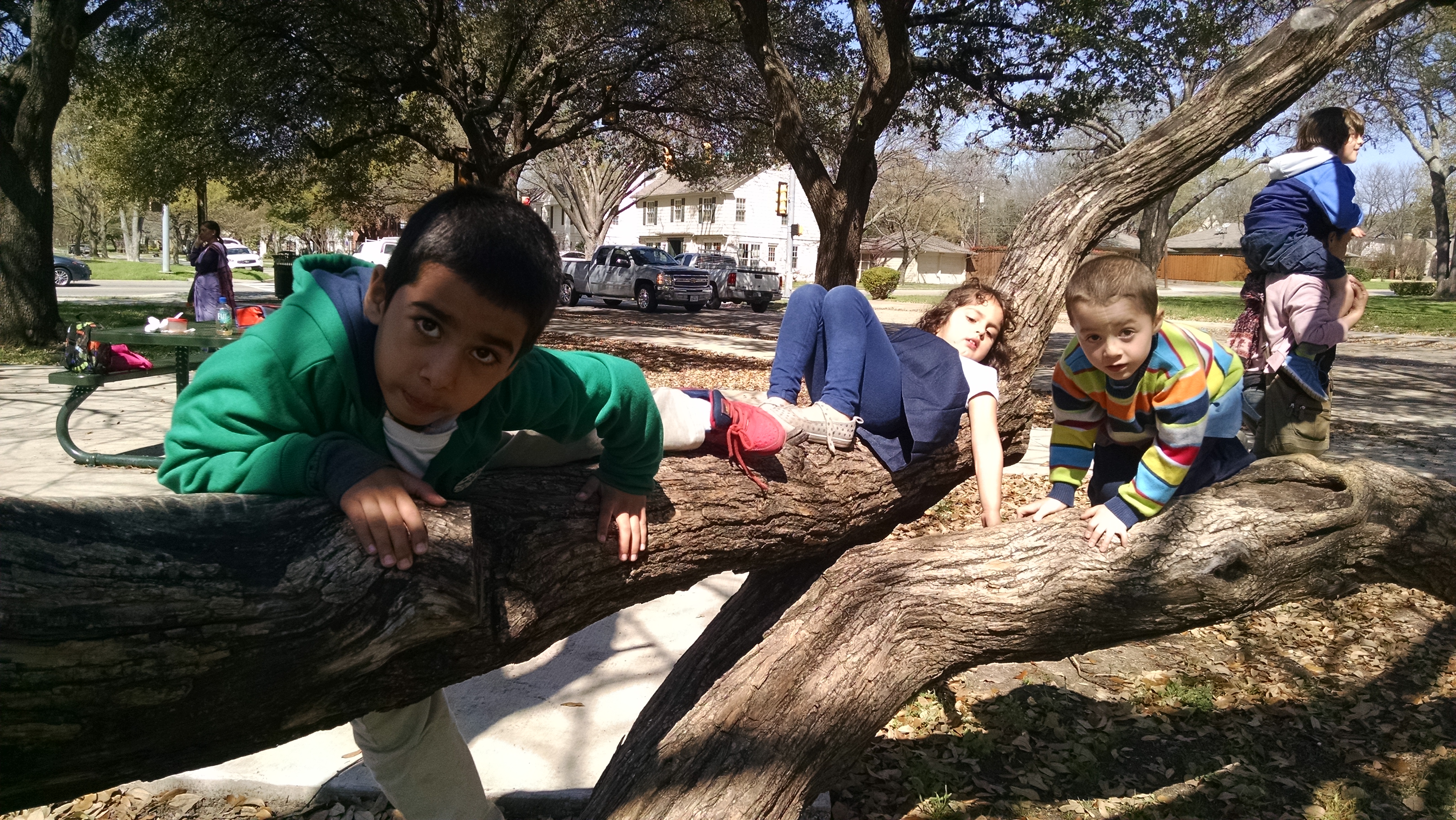 The appeal of the beautiful stage scenery of the woods and the garden demanded an outdoor picnic. Tietze Park, with its climbing trees, provided the perfect natural ground for play on this beautiful, sunny spring day!