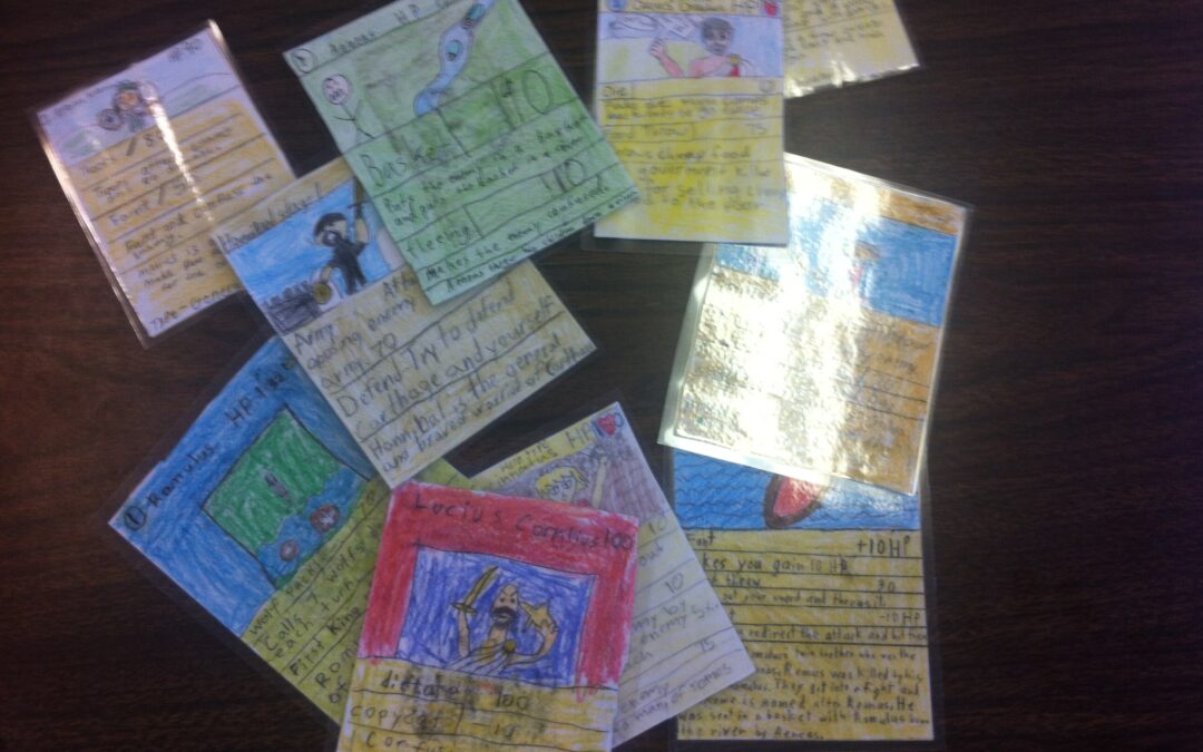 Fifth and sixth graders needed a hands-on way to remember the many historical figures they came across in their study of Ancient Rome. When I suggested “Romanmon Cards” – modeled after Pokemon cards, but containing information specific to our Ancient Roman personalities – students were immediately excited. They got to work right away, researching what the different Romans were known for and applying that to the cards.  Upon completing the project, students got to re-enact different struggles and battles by using the cards.