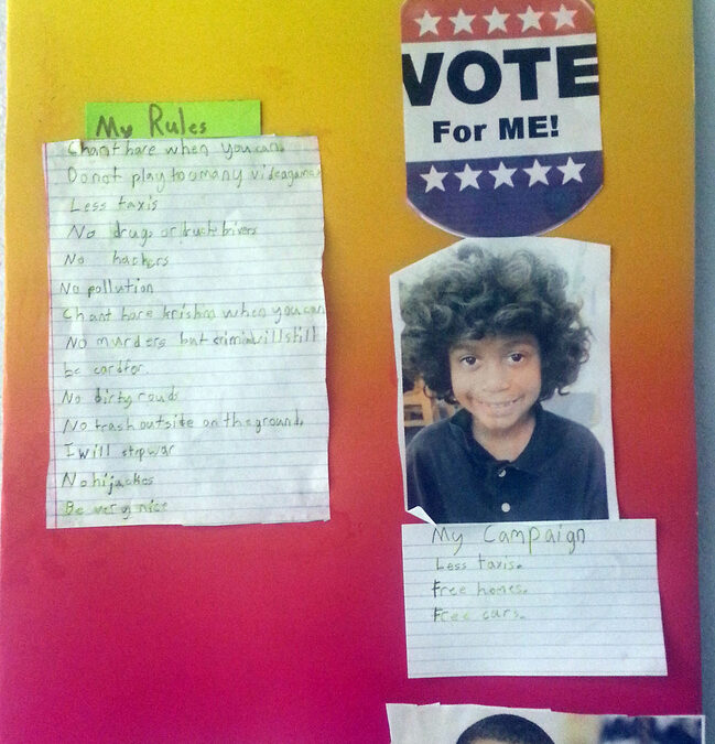 “No trash on the lawns.  No drunk driving.  No loud music after dark.”  One student, hearing from the news that Target credit cards were hacked recently added “No hackers!”    These 7 and 8 year olds were making policy. Each child picked a president to write about.  The active boys picked presidents that were generals in armies.  The girls picked those who had qualities similar to theirs.