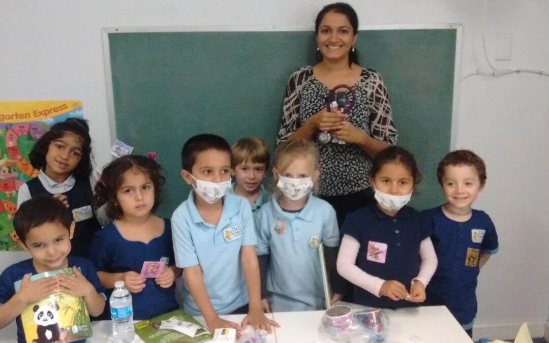When you are used to working with children, it shows! Dr. Devika Rao, MD. is a Pediatric Pulmonologist (as well as a mother), and being around young children comes naturally to her. She came very well prepared for her visit with our Preschool and Lower Elementary classes. She was equipped with an inhaler, an airway clearance “Vest”, a model of the lungs, an otoscope and an ophthalmoscope, a doctor gown and a young patient’s gown. She introduced herself, explaining why she chose to be a pediatrician and the path she took in obtaining her education and experience. She then taught the students the role and location of the lungs, as well as possible complications and their implications. She demonstrated the use of the various tools she brought and gave out decorated disposable face-masks to each student. She also brought along some relevant books and her important message for staying healthy was: wash your hands thoroughly and frequently! How long? As long as it takes to sing “Happy Birthday” 🙂 The visit was concluded with stickers for all the “patients”.