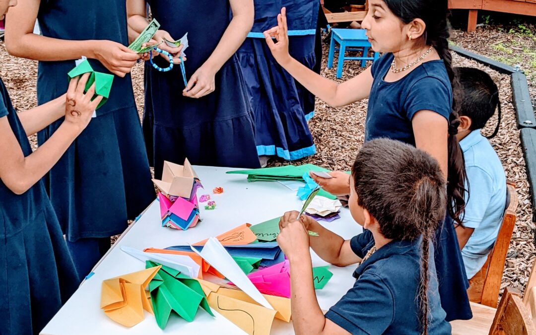 Each ‘customer’ is given $15 of play money. Even parents stopped by! From the 3’s to the teens, every student fills their arms with home-made paper delights. We had daggers, paper airplanes, origame creations, art pieces, books, necklaces and other jewelry, and more! The marketplace was full of buying, selling negotiating. Even the youngest (age 3!) had play money in their hands and were figuring out how much they would give and get back.