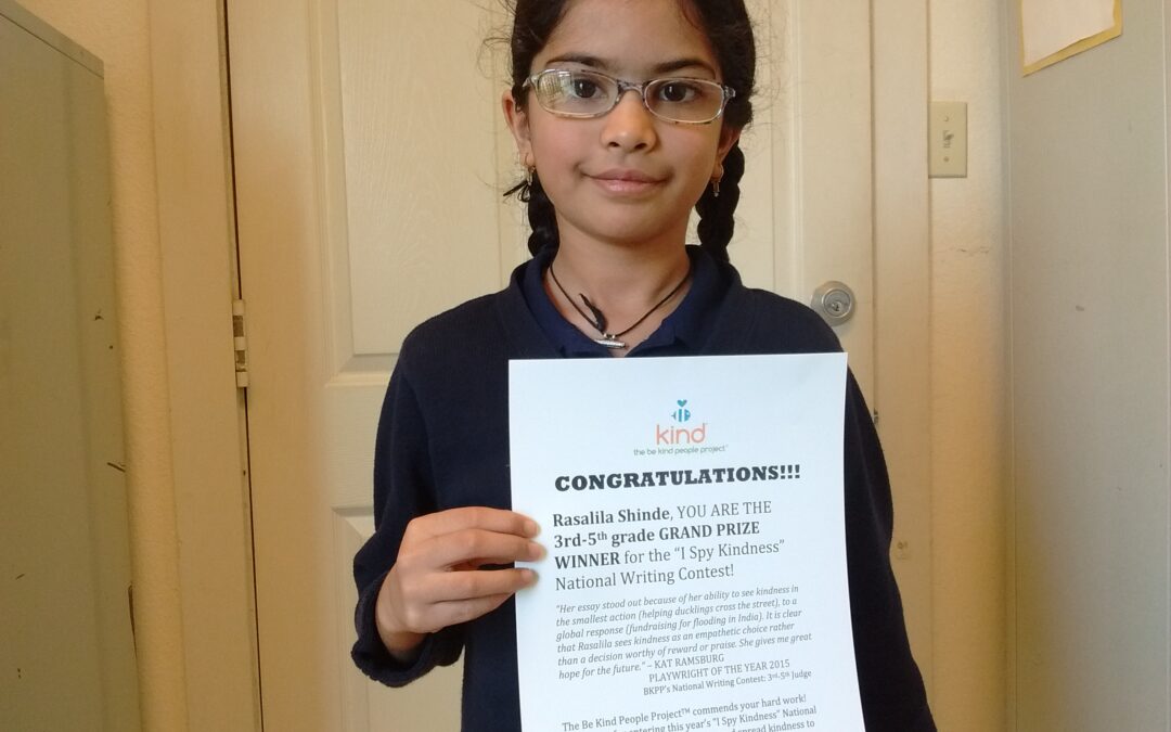 IMG_20160128_103608139Our dear 4th grader, Rasalila Shinde, has recently participated in a national “I Spy Kindness” writing contest and won first prize for the 3rd – 5th grade category. She wrote an essay describing acts of kindness she has witnessed and experienced in her life.