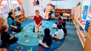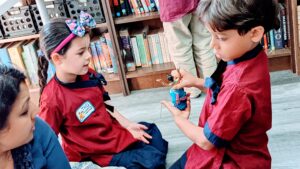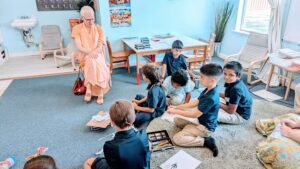 Students bathe and dress the Deities, learn to offer arati and give classes, and learn the Krishna is their best friend. They get visits from spiritual masters, play and dance every day.