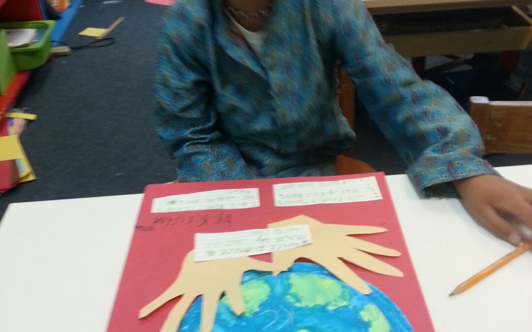 On Tuesday April 22nd, the Middle Elementary Class celebrated Earth Day, as part of the Social Studies Landform Unit.  We studied the Appearance of Varaha, how He saved Mother Bhumi from the hands of evil Hiranyaksha.  Armed with spiritual power to assist Varaha-deva in saving the Earth planet from harm, students began writing excitedly!
