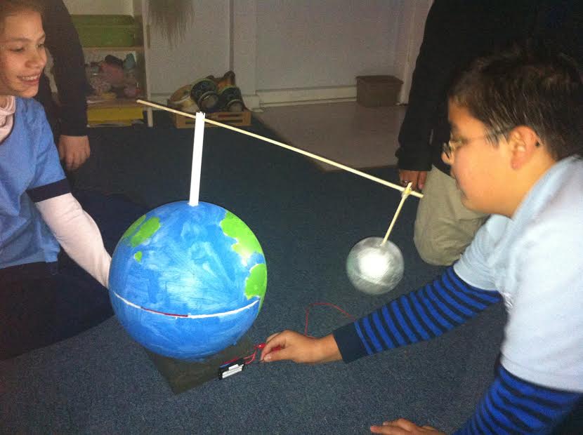 As a part of our Earth Science unit, students learned all about the moon – how it orbits the Earth, how it affects the tides, and how the lunar phases are caused. Vraja Kishor and Conor Jennings demonstrate the phases of the moon with their motor-operated model. Students also read what Srila Prabhupada had to say about the moon landing: