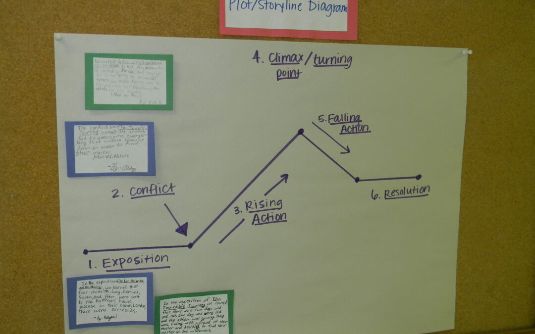 In Literature, the 4th- 7th graders are learning the basic elements of a story through the plot diagram, which is map of a story’s structure. Fourth and fifth grades are reading the fantastical story The Lion, the Witch, and the Wardrobe, while sixth and seventh grades are reading the heartwarming classic The Incredible Journey. As students progress in their reading, they are adding details from their respective books to the storyline diagram.