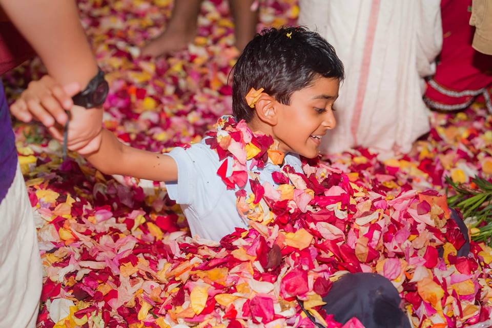 TKG Academy students have the greatest fortune to be actively engaged in Sri Sri Radha Kalachandji’s Dham’s famous festivals, serving Their Lordships Sri Sri Radha Kalachandji.  From reading mesmerizing pastimes about Srimati Radharani, to performing kirtan for the Vaishnavas, to dancing and jumping in the thousands of petals offered, their festival days are lifetime memories being created.  Take a look at the pictures.  Scroll down for the video of their Bhajan Presentation.