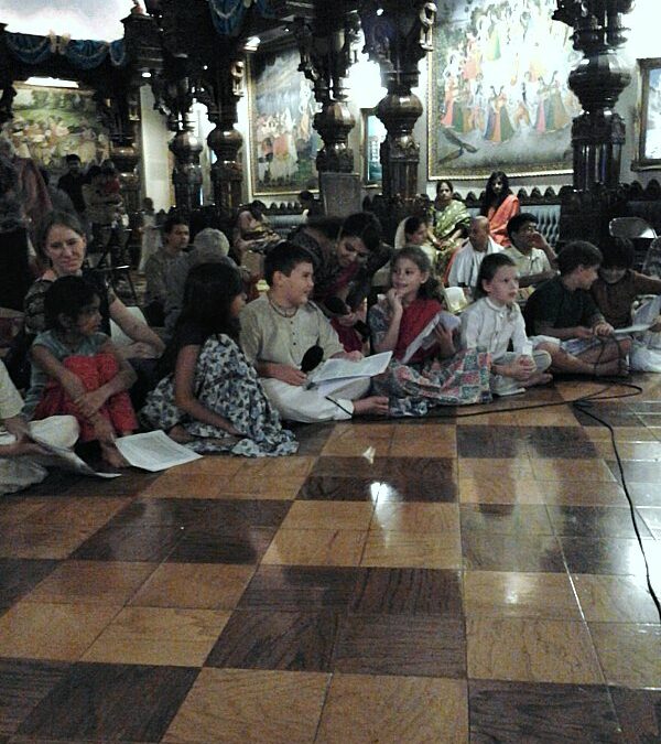 With freshly washed hair and clothing, Tilak applied beautifully, the children made their way to Sri Sri Radha Kalachandji Mandir with open hearts and helping hands to show Lord Krsna that even the youngest of the community are eager to please him, especially on his appearance day. Shortly after noon, the students of grades 2-8 gathered around to the front of the temple room to take turns reciting the story of Lord Krsna and the demon, Aghasura accompanied by a flute player. Then home to rest and prepare for the evening celebration of the Lord Krsna with friends, families, and devotees.
