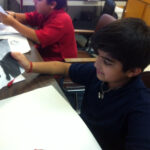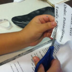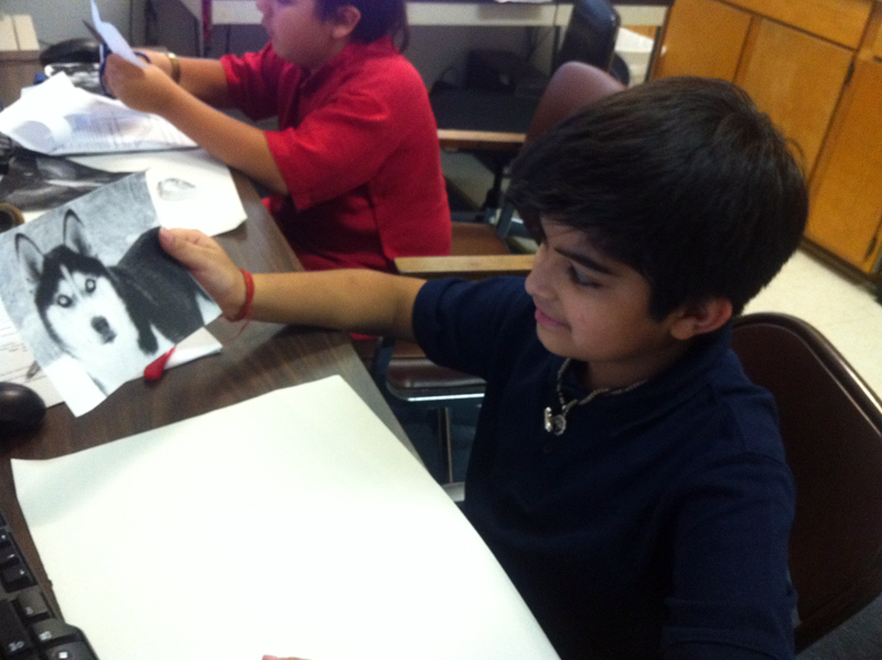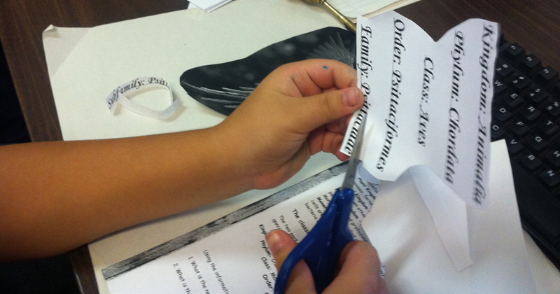 One student is researching his species on the computer; another is cutting and gluing, and yet a third is drawing his species. Students are excited and immersed.